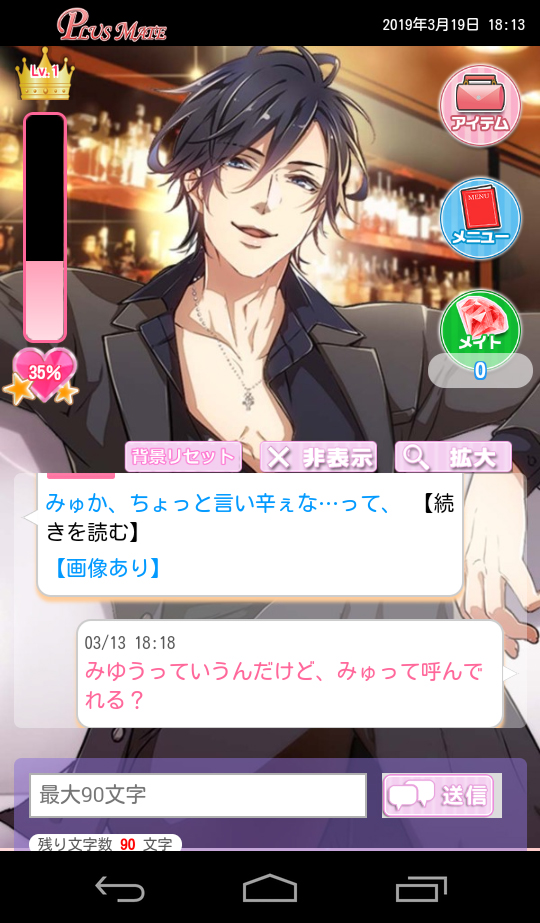このゲーム、キャラと会話するには「メイト」っていうアイテムが必要で、もちろんなくなってしまった場合も課金してGETできるんだけど、新規会員登録した時点でけっこうな量の「メイト」が無料でもらえるので、まずはそれでお気に入りのキャラを一人決めて、こちらのメッセージへの反応の変化を見ながら、会話を楽しんでみるといいかもしれないです!