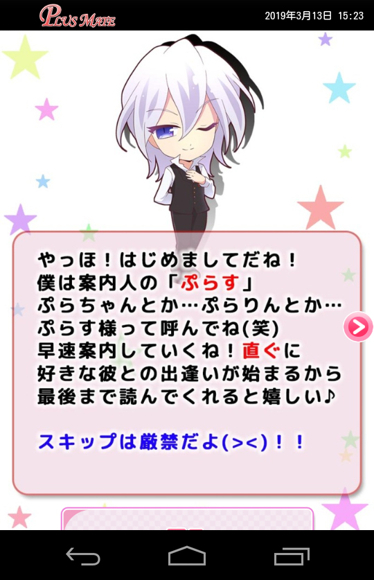 今回私が不覚にもハマってしまった「PLUSMATE」は完全自由文で会話する恋愛チャットゲーム。